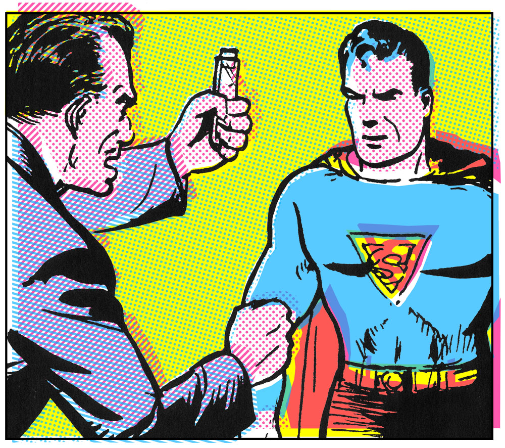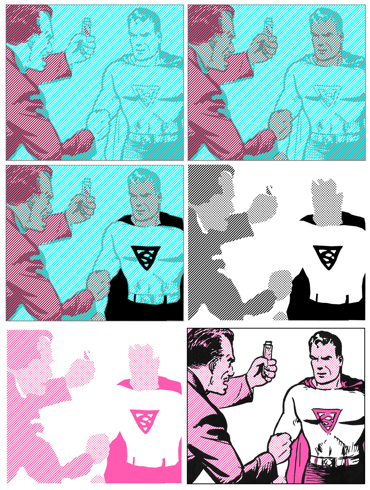 Or, to be precise, Superman magenta. The red parts of his costume will not be the correct scarlet colour until the magenta is overprinted on yellow—as we’ve seen in previous posts.