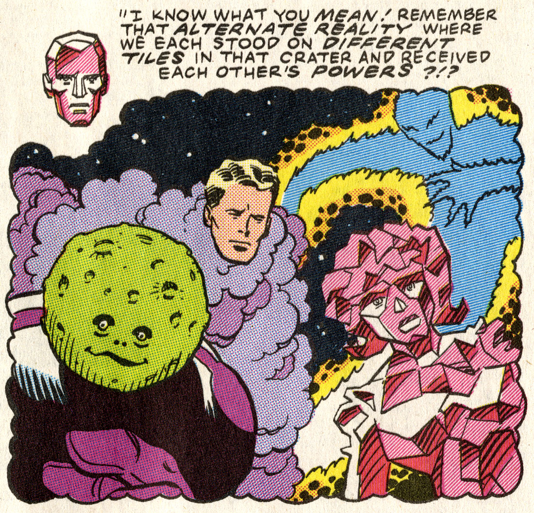 But 1963‘s inclusion of 50% line tints and 25% dots for the first time in nearly 40 years was a nice tip of the hat to the Golden Age technique [EDIT: or maybe it wasn’t… see below]. Perhaps too it was something of a statement that the early years of the Marvel superheroes could be seen as a continuation of the “innocent” Golden Age. In 1993, Moore expressed the opinion that it was all downhill after 1963, as Marvel became more knowing and ironic, and tried to broaden its appeal to older readers.