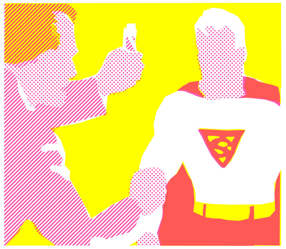Note that there is continuity between the yellow on Superman’s red cape and trunks and the background colour. Similarly with the bad guy’s hair. These areas merge into one.